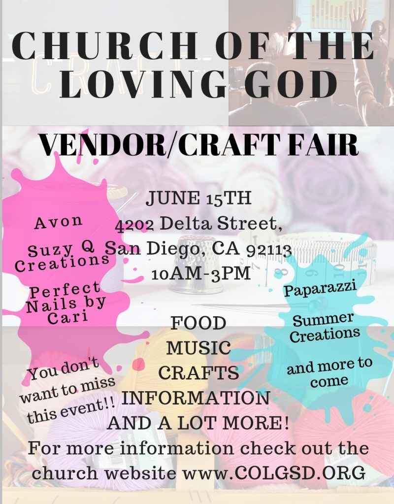 Please be sure to download and fill out your vendor application. You can send your completed application via email to: churchoflovinggod@gmail.com or mail it to 4202 Delta Street, San Diego, CA 92113 Attn: Vendor/Crart